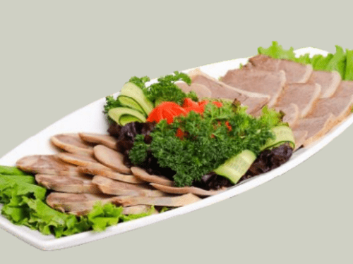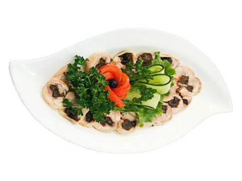 Говяжий язык, сыр, «Черри», огурцы свежие, грибы маринованные, майонез.