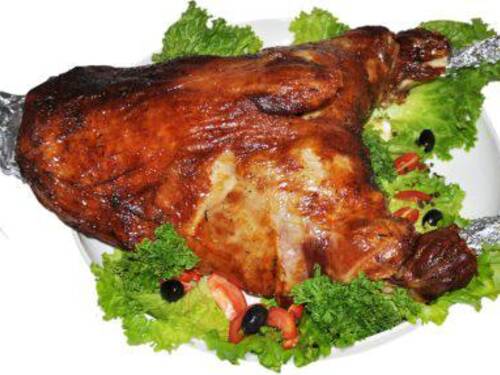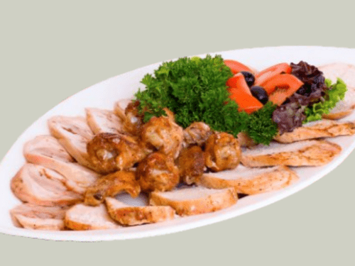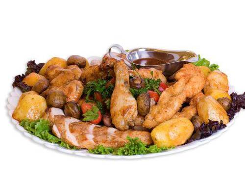 Цыплята табака, голень, куриное филе, крылышки, куриный рулет, куриные наггетсы, картофель запечённый, шампиньоны, «Черри», зелень. Банкетное блюдо.