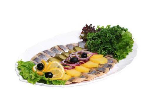Сельдь, маринованные огурцы, картофель, лук, зелень.