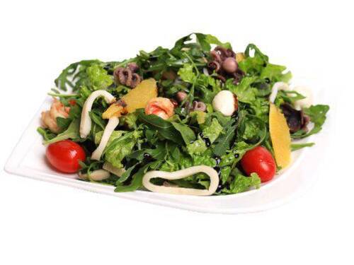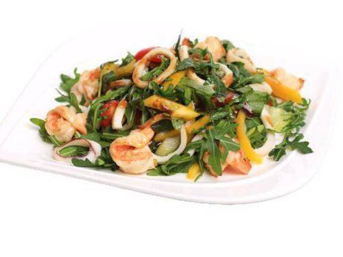 Креветки, кальмары, помидоры «Черри», сельдерей, перец светофор, руккола, соус «Терияки», оливковое масло.