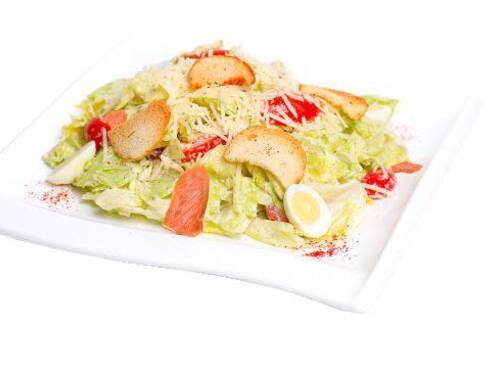Сёмга холодного копчения, айсберг, помидоры «Черри», сыр «Пармезан», перепелиные яйца, сухарики, соус «Цезарь» собственного приготовления.