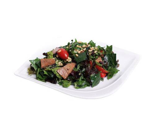 Конина, «Черри», лолло россо, руккола, шпинат, кедровые орехи, медово-бальзамический соус.