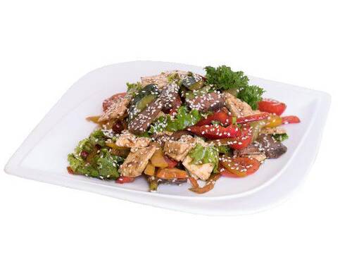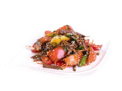 Говядина, огурцы свежие, перец светофор, помидоры свежие, морковь, лук репчатый, соевый соус, специи, оливковое масло.