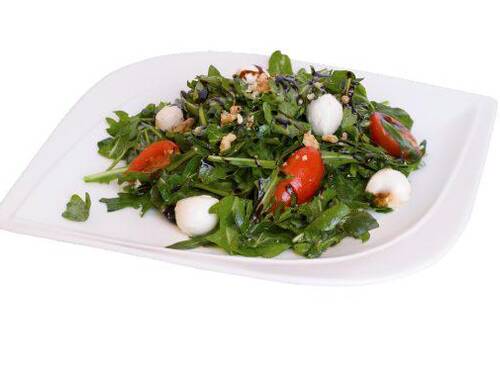 Руккола, сыр «Моцарелло гальбани», помидоры «Черри», грецкие орехи, соус бальзамический, оливковое масло.
