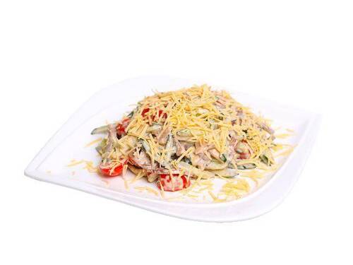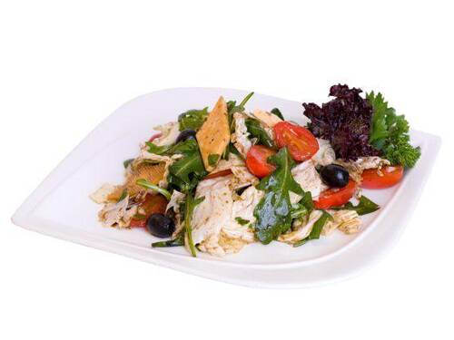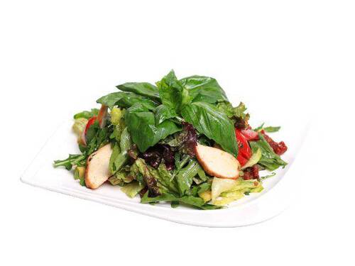 Куриное филе, перец светофор, цуккини, вяленые помидоры, лолло росса, айсберг, базилик, соус «Песто», оливковое масло.