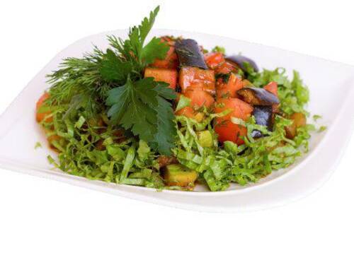 Баклажаны, кабачки, перец светофор, помидоры, листья салата, чеснок, соевый соус.