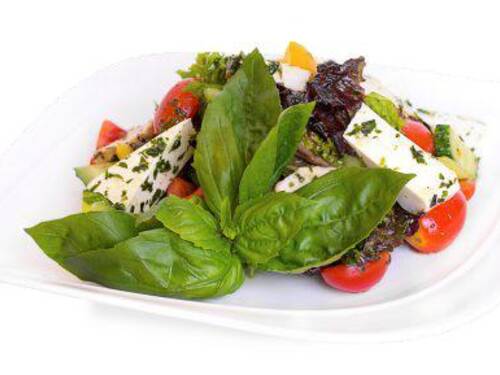 Огурцы свежие, помидоры «Черри», перец светофор, сельдерей, базилик, сыр «Фета», соус бальзамический, оливковое масло.