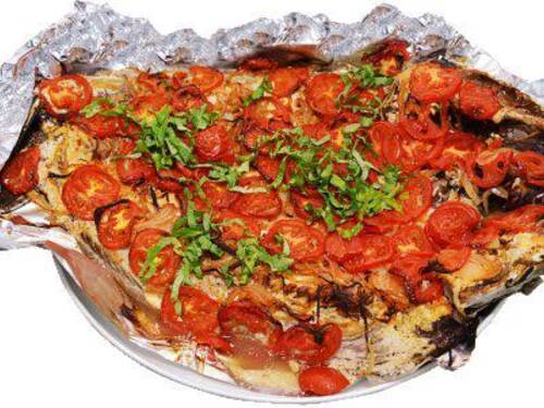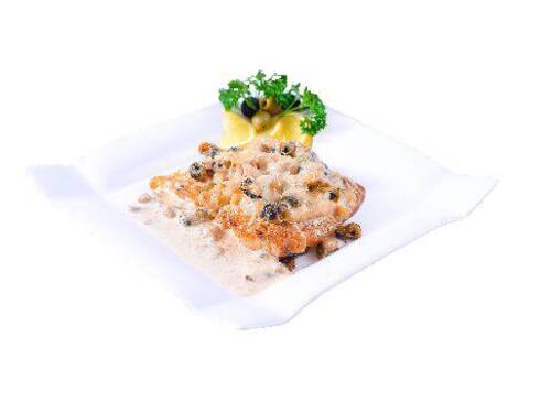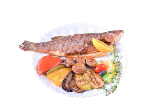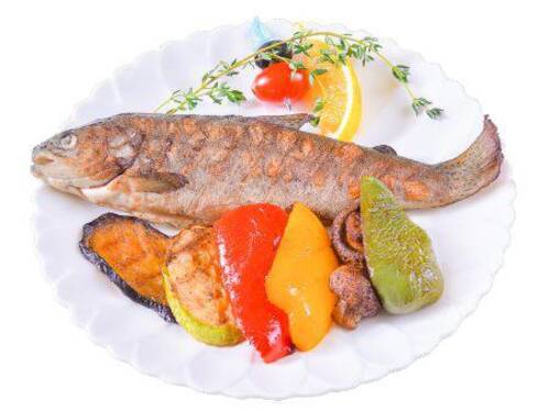 Филе сёмги, филе судака, перец светофор, «Черри», шампиньоны, ризотто, сливочный соус.