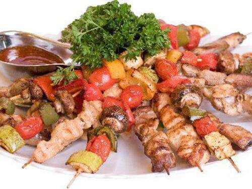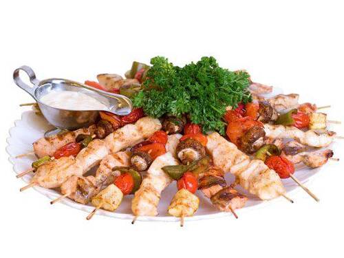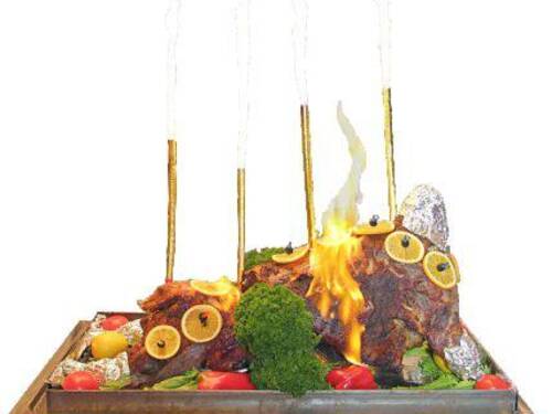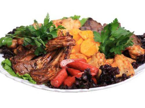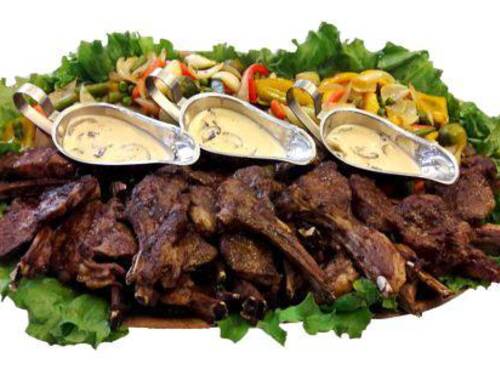 Говяжьи медальоны, бараний антрекот, куриные крылышки, утиная грудка, венские сосиски, рис. Банкетное блюдо.