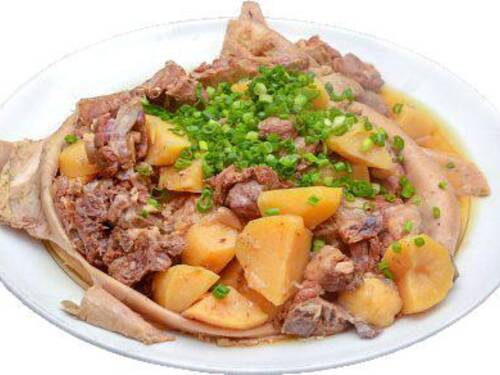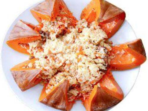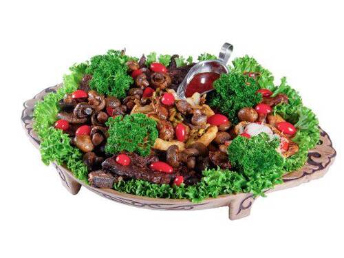 Куриное филе, перец светофор, фасоль, кукуруза, картофель пай, соус «Табаско», майонез. Банкетное блюдо.