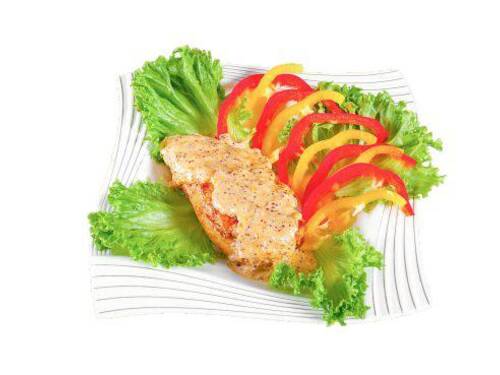 Куриное филе, фаршированное шпинатом, под горчичным соусом. Банкетное блюдо.