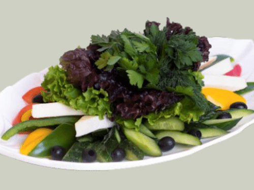 Свежие огурцы, помидоры, перец светофор, брынза, маслины, зелень.