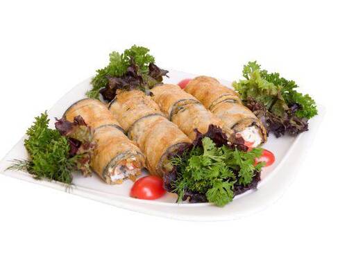 Жареные баклажаны, помидоры «Черри», чеснок, майонез.
