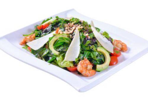 Королевские креветки, авокадо, помидоры «Черри», руккола, шпинат, лолло росса, сыр «Пармезан», соус бальзамический, лайм, оливковое масло.