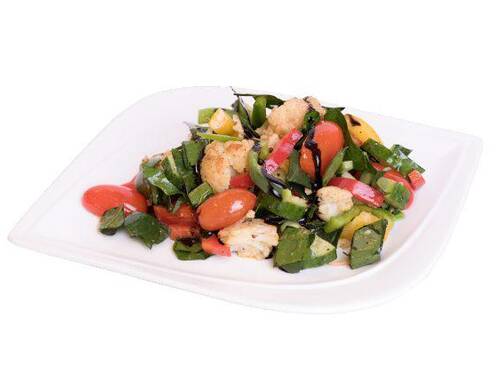 Цветная капуста, перец светофор, огурцы свежие, шпинат, помидоры «Черри», шампиньоны, соус пикантный.