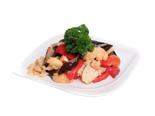 Цветная капуста, баклажаны запечённые, перец светофор, помидоры «Черри», куриное филе, соевый соус, оливковое масло.