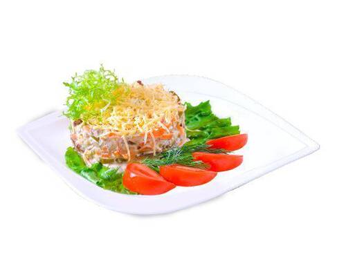 Куриная печень жареная, маринованные огурцы, морковь отварная, яйца, омлет, майонез. Банкетное блюдо.
